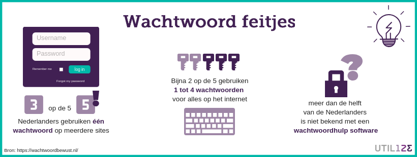 De afbeelding hierboven geeft het al aan. In Nederland gebruiken 3 op de 5 mensen hetzelfde wachtwoord voor meerdere sites. Eigenlijk maak je het voor hackers dan nóg makkelijker. Waarom zou je? We weten stiekem ook wel dit niet slim is. Kies daarom bij voorkeur voor een wachtwoord(zin) die past bij het type site of programma. Daarmee garandeer je dat het wachtwoord origineel is en dat je het kunt onthouden.